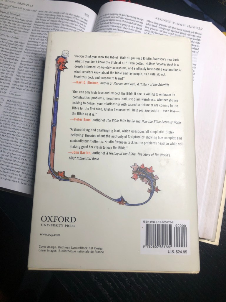 For veterans of biblical studies, unpacking the biblical corpus takes considerable work and knowledge. What hope does a mere novice have? Much if they have at their disposal Kristin Swenson’s A Most Peculiar Book: The Inherent Strangeness of the Bible (Oxford, 2020). Swenson, a professor at Virginia Commonwealth University, offers readers a fine introduction to the world of biblical criticism. Coupling a conversational tone to sound scholarship, A Most Peculiar Book (AMPB) would make a great addition to anyone’s library, but especially those who are just starting out in the world of biblical studies.