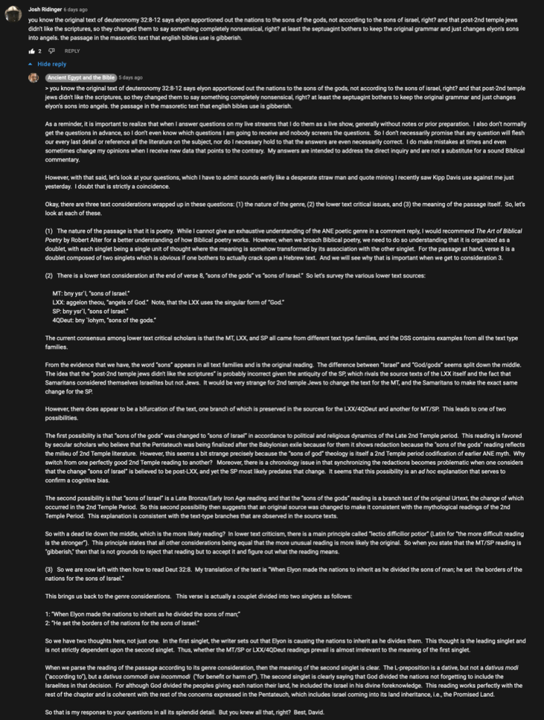 I have done my fair share of live streams, and I have entertained plenty of questions that I just don’t know enough about to offer a satisfactory answer. The proper response in these instances is to be honest about our limitations—even as specialists, and to move on. What is so extremely problematic about Falk’s approach—as outlined above—is that he will speak with equal confidence about matters in which he is actually an expert as he does when he is “riffing” on a biblical text that he has seen seemingly for the first time. By providing a disclaimer after the fact to inform his audience that “the answers are [not] even necessarily correct,” but without any indication of which answers those may be at the outset, is blatantly dishonest. How does a viewer ascertain when Falk is disseminating accurate information about the dating of Egyptian cities like Pi-Rameses and Pi-Thom, or about the rule of Rameses III, and when he is pontificating blindly about a textual discussion than he clearly has not followed like in Prof. Smith’s work on Deut 32:8– 9? When Falk pretends that all these things are addressed in equal measure he is misleading his audience insofar as his own qualifications to answer half of the questions he fields.
