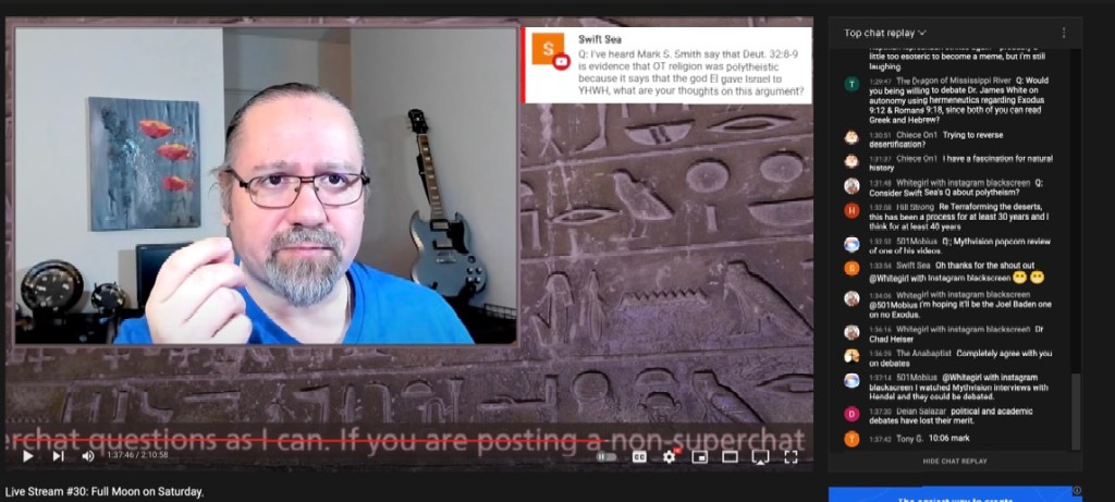 I think it is absolutely crystal-clear from the stream itself that Falk simply did not know at the time that he addressed the question of Mark S. Smith’s reading of Deut 32:8–9 the pivotal textual issues behind this passage. Furthermore, Falk also ignores the reasons for Prof. Smith’s discussion, which have come to form the consensus opinion within biblical scholarship. Here is the question as it was first posed to Falk by viewer, “Swift Sea”: “I’ve heard Mark S. Smith say that Deuteronomy 32:8-9 is evidence that Old Testament religion was polytheistic, because it says that the god El gave Israel to Yahweh. What are your thoughts on this argument?”