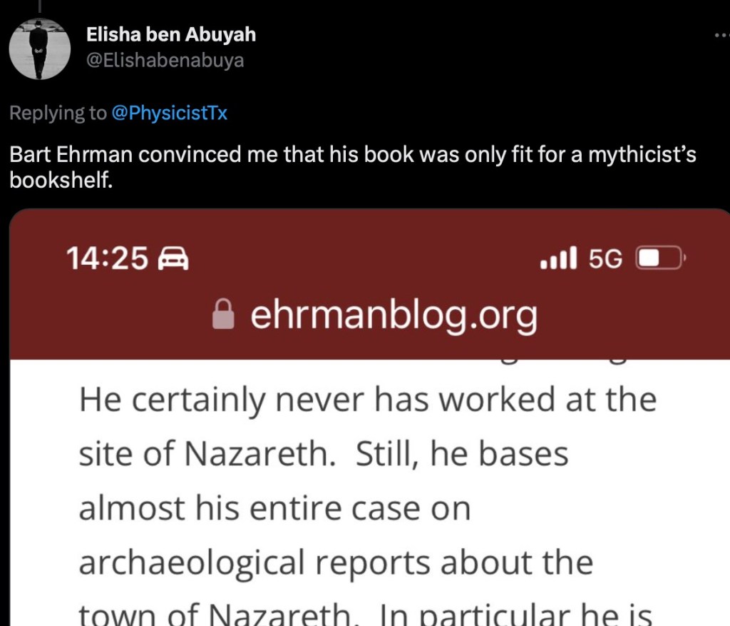 I’ve seen this sort of claim on social media before and it is quite obviously wrong. But this isn’t a post about the existence of Nazareth during the time of Jesus and so both of my readers will need to look elsewhere as to why Mythicists are wrong on this point.3 In any event, in the context of the thread, Paulkovich posted4 about René Salm’s The Myth of Nazareth published in 2008.5 In response to this, Twitter user @Elishabenabuya made the statement that Bart Ehrman had “convinced [him] that [Salm’s] book was only fit for a mythicist’s bookshelf” and included a screenshot from a post Ehrman had written on the subject.6