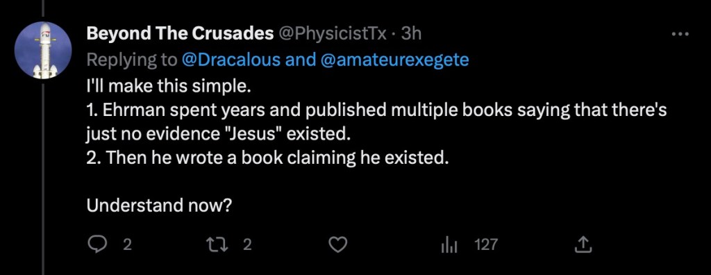 What Paulkovich is essentially implying is that Ehrman believes that there was no historical Jesus and claimed as much in his writings. But then with the publication of his 2012 book Did Jesus Exist?7 he makes a public-facing turnaround because, in Paulkovich’s words, Ehrman “knows on which side his bread is buttered.” He makes this even more apparent in this tweet: