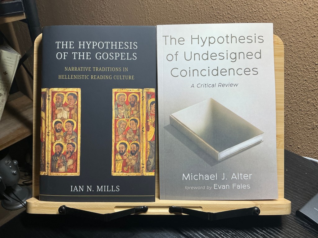 - A couple of new (biblical studies) books have landed in my library. Ian Mills’ The Hypothesis of the Gospels: Narrative Traditions in Hellenistic Reading Culture and Michael Alter’s The Hypothesis of Undesigned Coincidences: A Critical Review.